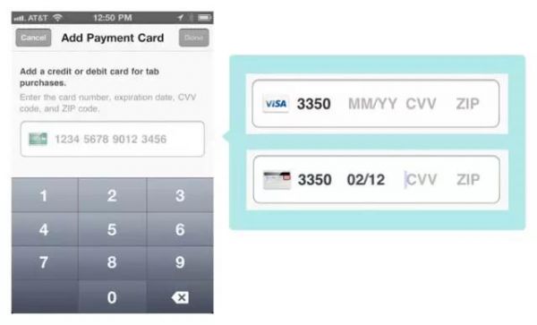 前段时间看到一个有趣的例子,这是某个应用中添加银行卡的页面。伴随着用户的输入,系统会自动判断银行卡的类型,银行卡的默认图标会变为正在输入的卡号对应的卡片类型。这种方式帮助用户省掉了一个选择卡片类型的步骤。另外,当用户正确的完成了16位卡号的填写,文本框会自动改变显示模式,之前输入的卡号只会显示出最后的4位,节省出的3个字段就分配给了有效期、CVV码和邮编。这里有一个很棒的细节,当用户在输入CVV码时,左侧的图标会发生变化(如图1),提示用户所谓的CVV码就是卡片背后的3位数字,非常贴心。这是一种很积极的信息回馈方式,让用户能够感受到系统对他们的操作产生了响应。