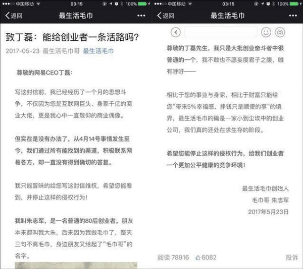 5月23日,价值兄了解到,一名自称为“最生活毛巾创始人”的一位创业者,因为自己的品牌与网易严选所销售毛巾发生品牌侵权争议,这位被称为“毛巾哥”的创业者呛声网易创始人丁磊,并发出了《致丁磊:请给创业者一条活路》的相关内容。 “因G20专供”,毛巾哥称被网易严选侵权 5月23日,价值兄发现,一位自称“毛巾哥”的创业者,发布了一篇题目为《致丁磊:请给创业者一条活路》的文章。该文在数小时内阅读量就超过了6万次,点赞数量更是超过5000次。在这篇文章中,“毛巾哥”朱志军称,在4月14日发现了网易严选上架的一款“阿瓦提毛巾”与自己的“最生活毛巾”太相似了——“发现 除了包装,风格与描述实在太雷同了”!此外,网易严选还将这款毛巾作为“G20专供同款”毛巾,而这与最生活毛巾此前“ 成为了G20 唯一指定毛巾品牌”。此举涉嫌虚假宣传,以及欺诈消费者等问题。 在与网易严选客服进行多次沟通无果后,“毛巾哥”一怒之下发表了这篇《致丁磊:请给创业者一条活路》。