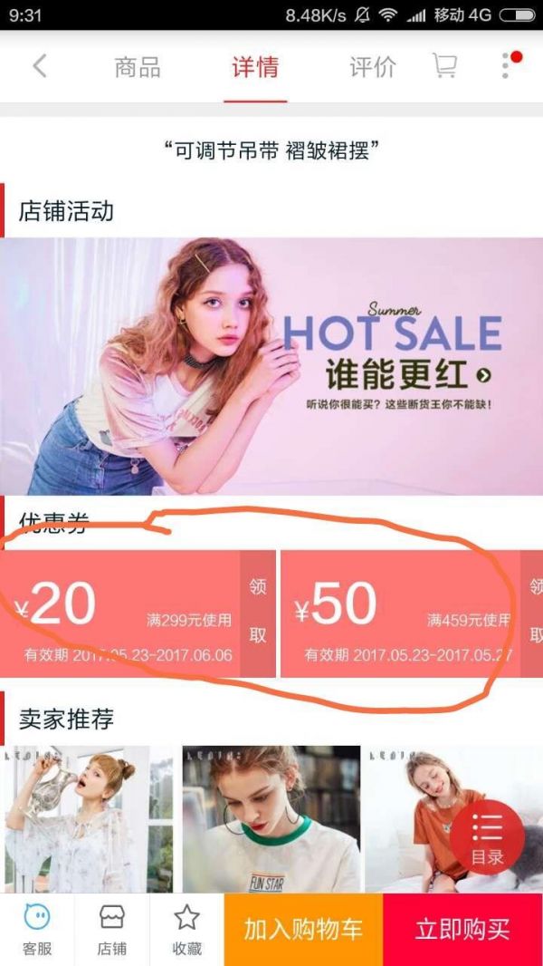 图2:优惠券出现在商品详情页 图2:在商品详情页,在用户想要更细致观看商品细节时,第二次提醒用户可以领取优惠券;