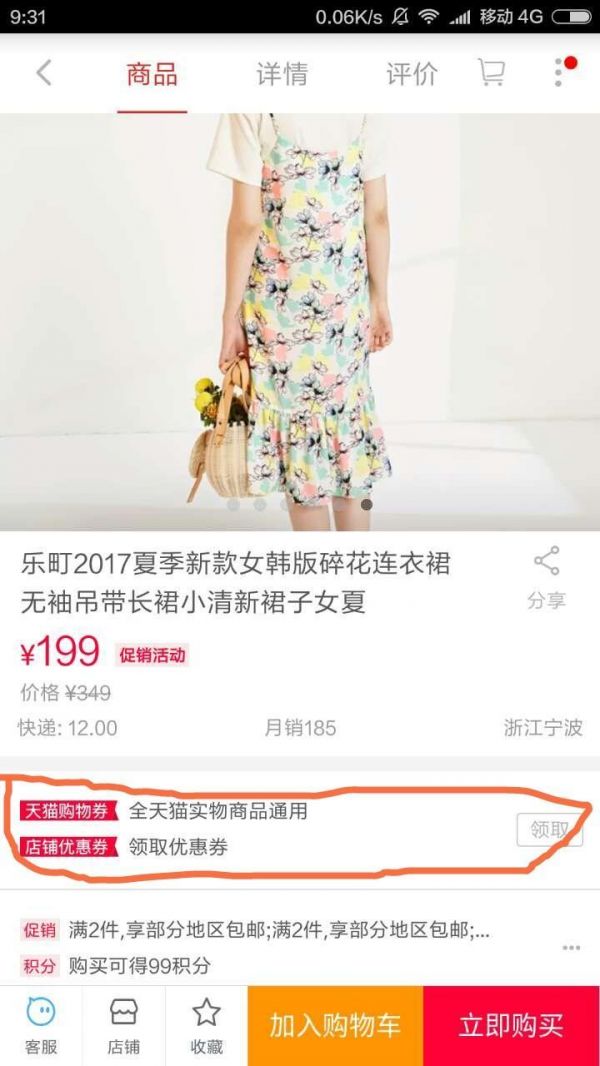 图1:优惠券出现在商品主页面 图1:在商品的基本信息下面直接出现优惠券的提示,第一次提醒用户可以领券;