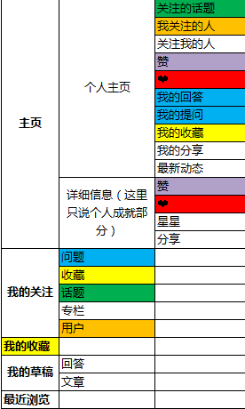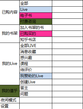 页面梳理(2) 重复的功能入口 通过页面梳理,我们看知乎“更多”页面的重复的功能入口: 绿色部分:个人主页-我关注的话题=我的关注-话题 橘色部分:个人主页-我关注的人=我的关注-用户 蓝色部分:我的回答+我的提问=我的关注-问题 黄色部分:个人主页-我的收藏=我的收藏(一级页面)≠我的关注-收藏 紫色部分:个人主页-赞=详细信息-赞 红色部分:个人主页-?=详细信息-? 浅蓝色部分:已购内容-Live=我赞助的Live 玫红色部分:已购内容-电子书=我的书架-已购买的 墨绿色部分:付费咨询=我的值乎 存在的问题 通过对上面重复功能的分解,笔者认为存在如下问题: (1)不同功能入口之间没有构成明显的类功能分布区 重复功能中的1、5、6功能相同,但是并没有起到联系不同使用场景的作用;而不同的功能之间,其关联本来就不是很明显,加上相同功能的入口太多,且分布在不同页面区域,让用户理解某“类功能分布区”的成本很高。 笔者的定义,所谓的类功能分布区,是指在APP的有限界面内,更具有相似性或连续性的功能集中分布在某一个区域。 以天猫(V6.0.0)为例,“我”的页面主要分为三块区域。
