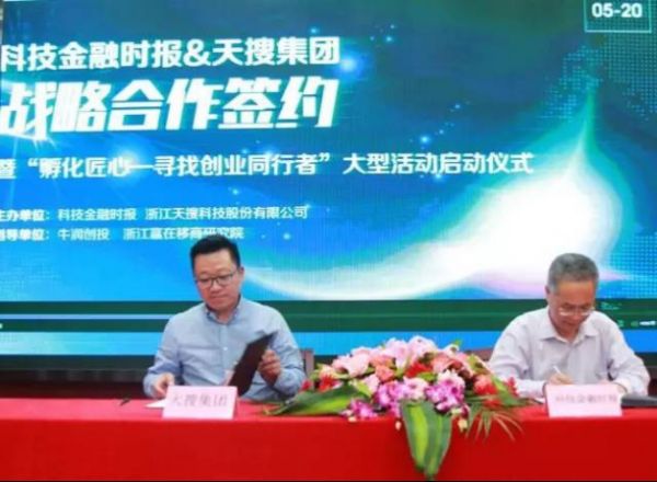 5月20日,2017浙江科技活动周开幕式在杭州隆重举行。开幕式上,浙江省移动互联网行业标杆企业浙江天搜科技股份有限公司(以下简称:天搜集团)应邀出席,并与浙江省高端财经类媒体《科技金融时报》正式签署合作协议,宣布将联合出版科技创业类图书,并在此基础上不断深化合作。同时,此次签约也标志着天搜集团“孵化匠心——寻找创业同行者”大型创投活动正式启动。