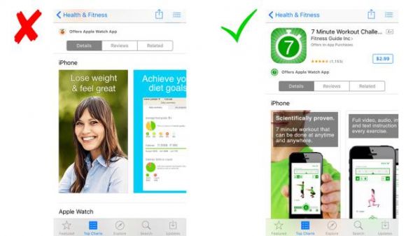 八、突出独特的功能或卖点 在超过200万应用的App Store中,无论你的应用满足的是用户的哪种需求,总能发现一些类似的。所以,在截图中直接描述它的独特功能以及哪方面做的更好等等会比描述普遍功能更吸引用户。 以下面两款应用为例,虽同属健康健美类应用,但右边突出以自身的体重为阻力的无器械健身以及7分钟训练等卖点的截图明显更吸引人。