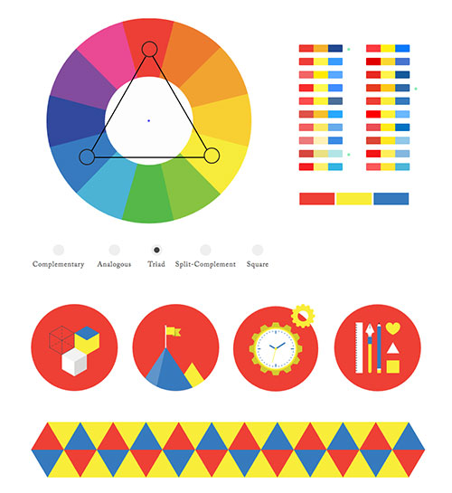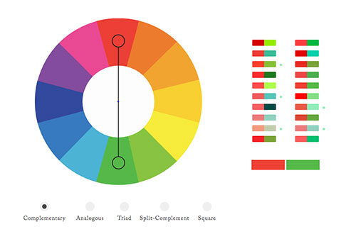 ColorSupply 小编查看了下网站,发现网站还有些功能在完善当中,我们打开网站后,主要有三大区域: 1. 五大配色方案类型:互补色(Complimentary)、相似色(Analogous)、三色调(Triad)、分离互补色(Split Complimentary)、四色调(Square)。 2. 配色方案:在12色环右则是对应类型的配色方案。 3. 效果图预览:网站下面的平面插图可以根据选中的配色方案自动上色,如此一来用户就可以看到配色方案的大概效果。
