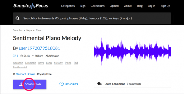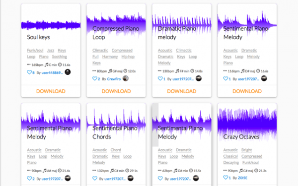 STEP 3 试着把鼠标光标移动到各个音效素材上,音乐会自动播放,其实还蛮方便,每个取样上会有图标、名称、卷标、音调及时间长度等信息,点击「DOWNLOAD」就能跳转到该音效素材的下载页面(不同颜色应该是代表不同的乐器类型)。