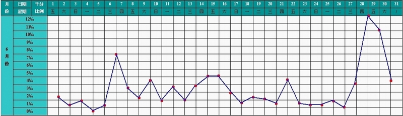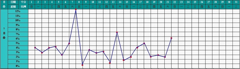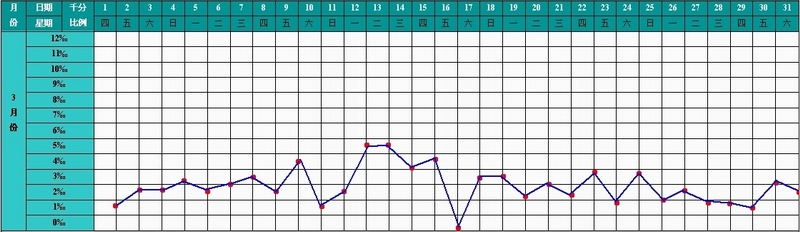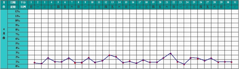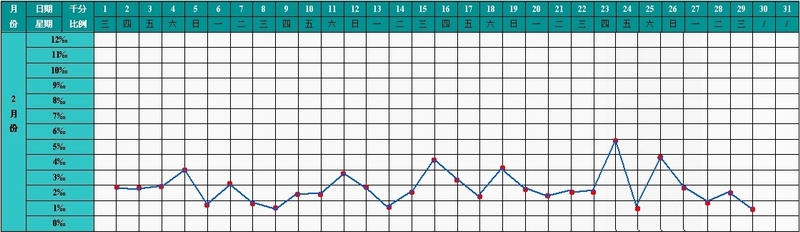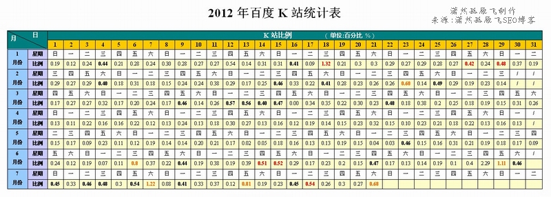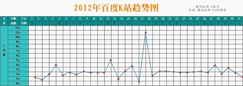 备注:《2012年百度K站统计表》是将2012年每天百度K站的比例按日期和星期进行列表,在K站茫围的几个数据给予加粗,对K站异常的几个地方用红色给予标注. 也许有此朋友看了以上一些数据还是觉得有点晕乎和不好理解,为了更直观地了解数据上的变化,潇然孤雁飞特为大家制作了一个走势图。闲话少说,直接上图。