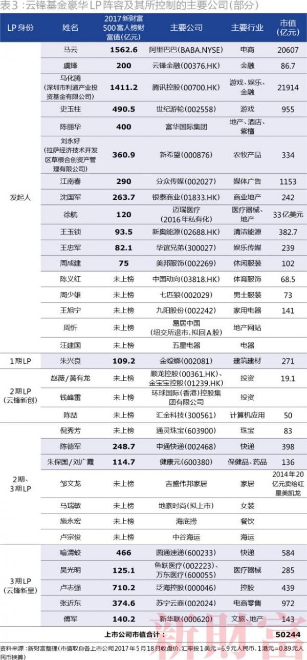 据新财富统计,2017全中国最富500人中,至少有20位上榜富人为云锋的LP,其中12位LP更跻身中国最富百人之列。这些人不仅富甲一方,更控制一票上市公司资源,即使不完全统计,云锋基金LP所控制的上市公司市值加总也已超过5万亿元。 这些名单带给了外界巨大的震撼。募资从来是PE生存的第一道关卡,但在云锋基金的运作中,这似乎不是问题。云锋基金创立之时,王玉锁甚至宣称:“未来投资行业会产生新的方程式:马云+虞锋>索罗斯!” 集齐马云、虞锋朋友圈富人的云锋基金,的确有能力“召唤神龙”。而随着一大批明星项目的相继曝光,自带光环的云锋基金,更令人目眩。云锋基金入股本身就能给初创企业带来极大的关注度,更不论云锋的投资名单中,的确包含着阿里巴巴、华谊、中信21世纪、大麦网、华大基因等诸多声名显赫之作。 豪华LP天团的投资生态圈 对于PE来说,最重要的三件事情就是退出、退出、退出。云锋基金所投颇多明星、稀缺项目,得益于众多LP发挥了重要的作用。顶级富豪的消化能力,在云锋一些项目的退出上,也能助力。 马云就不说了,云锋1期基金的主打项目——阿里巴巴私有化、分拆搜狗,2期基金里,回报率倍数最高的阿里健康,以及圆通速递,加上3期云锋新呈所投的未来想象空间很大的蚂蚁金服,都与阿里有着千丝万缕的联系。 马云的影响力不容小觑,而从云锋基金身上赚到钱的其他LP们,几乎个个声名显赫,他们或多或少都有个人股权投资的成功经历,或所在企业已与资本市场有过多次交手,不少LP还手握上市公司,成为投资项目的潜在合作方。云锋基金、LP、云锋基金所投项目、LP所控制的上市公司,构成了一般PE难以企及的生态系统。可以说,LP将资金交给了虞锋率领的云锋团队,而他们也没有辜负这份信任。 在云锋基金成立之后,这种圈子内的合作、互助、共享等精神更淋漓尽致地发挥了出来。比如云锋基金在LP朱兴良危难之际,加持金螳螂。 凯雷和云锋一起投资的环球数码科技,本打算在纳斯达克挂牌,2013年5月已经提交了招股预案,但恰好遇上中概股暴跌,市场形势极度恶劣,其IPO终止。这家上市不顺利的数字影院解决方案提供商,最终被处于同一产业链上的华谊国际——华谊兄弟的子公司收购,云锋顺利退出。虞锋、马云是华谊的战略投资者,而王忠军也是云锋的铁杆LP。 同样的,鱼跃医疗的创始人吴光明为云锋基金LP,而当他寻求通过资本方式整合华润万东时,云锋基金也和上海云雀等一起参与了非公开发行股份的认购。而云锋参与投资的白云山、万东医疗,又都分别和云锋控股的阿里健康展开了合作。 赵薇——这个被冠以“娱乐圈女巴菲特”之称的名演员,在资本圈成名于大手笔投资阿里影业,她本人是云锋2期人民币基金的LP,丈夫黄有龙也是云锋金融的大股东。当赵薇脱离了这个圈子,试图独自高杠杆收购万家文化时,就摔了个结实的跟头。 寰亚传媒虽头顶林建岳和虞锋两大光环,但上市后的经营业绩却只能用惨淡来形容,此前市值一度只有7亿港元。在云锋退出之前,虞锋担任董事的陌陌出现在寰亚股东名单里,这是否受益于虞锋的牵针引线呢? 巨人网络通过云锋投资阿里巴巴员工股,获得4倍回报。而在巨人网络私有化并借壳世纪游轮一案中,云锋通过铼钸投资,获得了10倍回报。 (责任编辑:admin) |