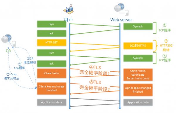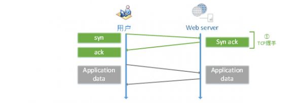 图 1 HTTP 首个请求的网络耗时 可见,用户只需要完成 TCP 三次握手建立 TCP 连接就能够直接发送 HTTP 请求获取应用层数据,此外在整个访问过程中也没有需要消耗计算资源的地方。 接下来看 HTTPS 的访问过程,相比 HTTP 要复杂很多,在部分场景下,使用 HTTPS 访问有可能增加 7 个 RTT。如下图: