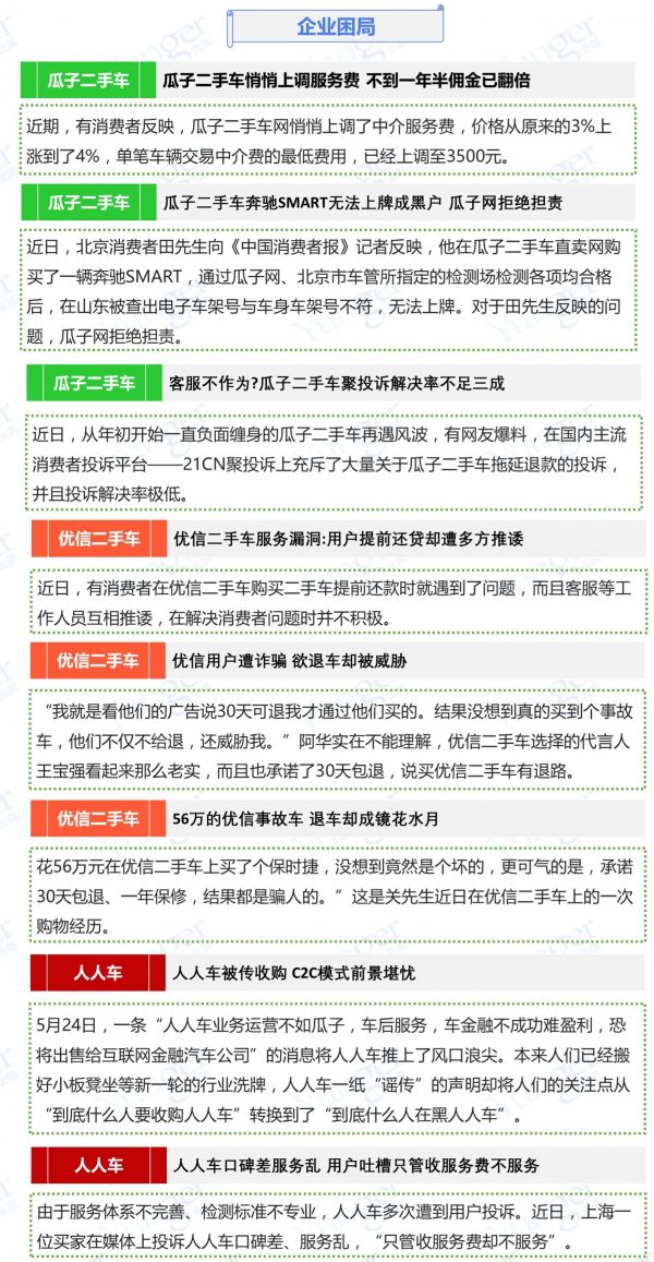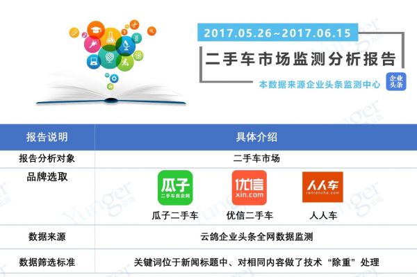 懂懂笔记继续从舆情角度来分析二手车行业,本期报告监测时段为5月26日至6月15日的三周时间,监测对象是瓜子二手车、优信二手车以及人人车等三个二手车电商平台。在分析报告中,企业头条与懂懂笔记对上述三个平台从多维度进行了对比分析。
