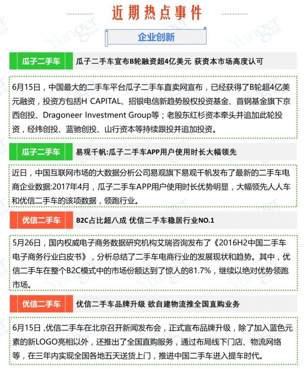 在这三周的监测中,懂懂笔记发现,三个平台都存在一定的创新。其中,瓜子二手车获得了新一轮融资,将在技术、团队、品牌等方面持续投入,核心技术“瓜子大脑”也在不断升级;优信二手车也寻求品牌升级,布局线下门店,推出全国直购服务。