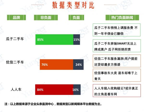 最后,在品牌声量对比中,整体领先的是瓜子二手车,人人车处于中游,优信二手车的声量最低。但是,在品牌正负面消息中,三个平台都存在一定的负面,其中优信二手车因为事故车、服务漏洞等问题,在监测期内以24%的负面处于劣势;瓜子二手车和人人车的负面情况相仿。