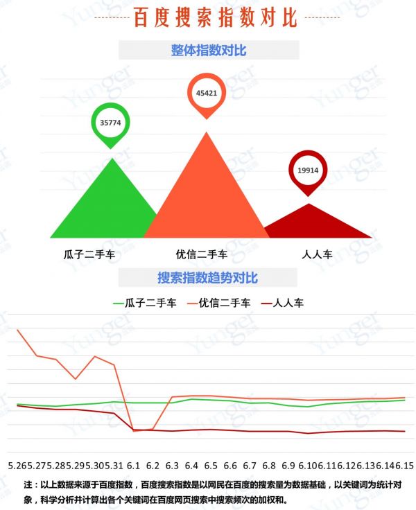 首先,在百度搜索指数对比中,优信二手车以45421领先,瓜子二手车以35774位居第二位,人人车稍显劣势以19914排在第三名。在搜索指数趋势对比中,瓜子二手车呈现相对平稳的状态;优信二手车的在监测期前半段有明显的下降,在6月3日开始回升继续领先;而人人车仍然以不小的差距落后于前两者。