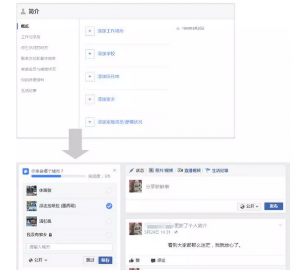 3.3降低执行门槛,快速融入 在告知用户预期产出的基础上,让用户快速进入流程,是完成任务产出结果的第一步。当用户迈出了第一步,相当于打开了第一个突破口,执行流程就可以一步步打开。 作为社交平台的Facebook,用户的个人主页承载了个人资料和动态,引导用户完善资料能够促进彼此社交关系的建立。Facebook并不是在用户创建帐户初期就让用户完成所有个人资料,而是将资料内容拆分,让用户每次完成一项资料填写,并将填写引导融入到主页中,使用简洁有力的提问吸引用户逐步完成所有资料填写。