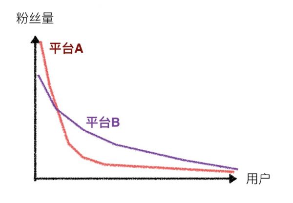 今天,我们来聊聊UGC。 UGC不是工具产品,不是新闻客户端,不是电商或者游戏。只靠好产品不行(如足记),只靠业务逻辑不行(如头条),更不能每天喊用户“快来留言吧”(如美团)!UGC是一门艺术,一门构建生态的艺术。 成功构建一款UGC产品,你需要取势、明道、优术。 取势 几乎每个UGC平台的生与死,都伴随着互联网浪潮的更迭。 0X年,网民多是精英阶层,各类聊*室崛起。我高中的语文老师是名50多岁的饱学儒生,最喜欢新浪聊*室的对联雅座。你能想象么?每天几百个人热火朝天的对对联——一担重泥拦子路,两岸夫子笑颜回。 几年后,web2.0时代来临。上网人数进一步增多,也更加年轻化。主打明星八卦、小说连载的天涯、猫扑兴起。06年,当年明月的《明朝那些事儿》在天涯的煮酒论史板块连载,访问量迅速突破百万。 同期,网民基数的增大,让垂直论坛成为可能。阿北创办豆瓣,暗暗开始缓慢的用户积累。07年,张玮玮将自己的新歌「米店」上传到豆瓣,10年后,随着老狼在《我是歌手》上的演唱大火。 05、06年,视频UGC土豆、优酷相继上线。05年胡戈将陈凯歌的《无极》重新剪辑成短视频《一个馒头引发的血案》,成为爆款。但国内短视频制作能力过弱。优酷土豆很长时间内只能靠用户上传的盗版电影过日子。 接下来几年,网民基数进一步扩大,上网成为普通人日常生活的一部分。网络内容愈加碎片化。 10年,新浪微博上线,4年后登录纳斯达克。微博通过140字的限制降低了制造内容难度,文字与图片进一步融合,微博类产品创造了“关注”这个动作,内容分发有了全新的方式:基于关系链。 11年,苹果经典一代iPhone4s发布,同年小米1发布。移动互联网大潮来临。 11年,微信发布第一版。12年上线朋友圈,13年订阅号上线,同年微信注册用户突破6亿。成为亚洲区用户规模最大的App。 还是11年,知乎上线,13年开放注册,一年内注册用户由40万攀升至400万。 在这段时间,03年上线的家长帮,07年成立的宝宝树,05年成立的糗事百科等一批垂直UGC纷纷完成移动化,并迎来新一轮爆发性增长。新型导购类UGC蘑菇街,美丽说等出现。 一二线城市换机潮过后,三四线城市用户也开始弃用功能机,改用智能手机。 14年,GIF快手更名为快手,由工具切入短视频,迅速向三、四线城市下沉。采取同样策略的还有微博、OPPO、VIVO。 16年,陌陌推出直播业务。当年营收超过5亿美元。 历次网民规模的扩充,终端设备的更迭,产业的变化,都会产生数个UGC平台。早或者晚,都不行。 优酷生早了,本来是短视频UGC,活成了OGC,靠购买电影、电视版权+自制节目过日子。腾讯微博做晚了,只能草草收场。 UGC的特别,就在于内容是由用户产生,大量用户才能成势,构成UGC的生态。因此,时机的选择就显得异常重要。 取势,是一个UGC平台成功的前提。 明道 UGC的道,最核心的有两条。 (一) 别把鸡蛋放在同一个篮子里 投资讲究风险错配,UGC讲究内容错配。 如果将UGC平台里的用户按粉丝量从高到低排布,可以得到下面的粉丝分布曲线图。 假设有两个平台的粉丝分布如下,平台A和平台B,谁更健康?