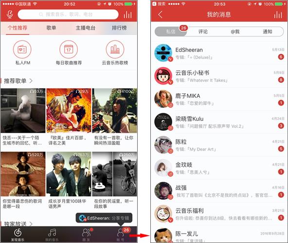 因此,要跳出竞品带来的“刻板印象”,就不单单要立,还要破,然后再要立。也就是,先做研究;然后抛开竞品、基于自己的需求做设计;最后再回归竞品,看看自己的方案是否更好。 二. 用户操作效率:能不能再快一点 当大多数产品的消息提醒都是一级一级的红点,然后一级一级点击进去的时候,云音乐没有这样做——点击账号tab直达要提醒的消息,如下图所示。