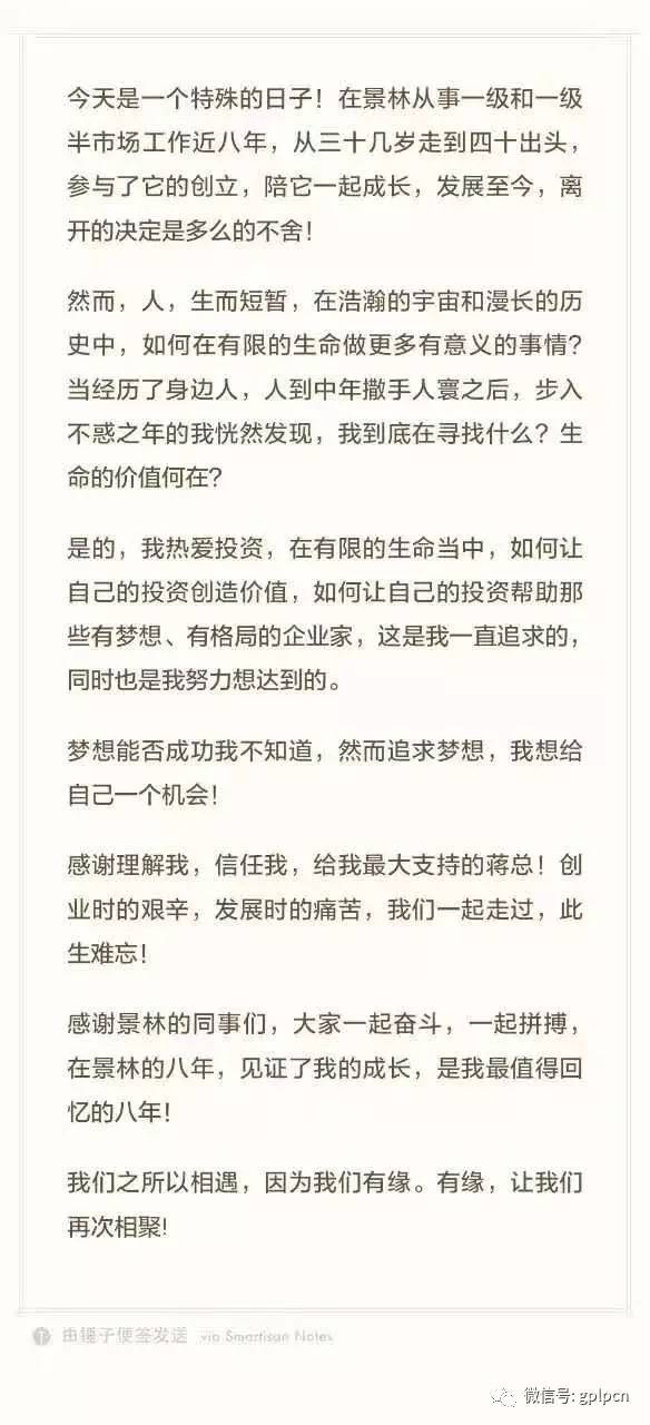 人,生而短暂,在浩瀚的宇宙和漫长的历史中,如何在有限的生命做更多有意义的事情?当经历了身边人,人到中年撒手人寰之后,步如不惑之年的我恍然发现,我到底在寻找什么?生命的价值何在? 投资大佬的离职潮还在继续,既GPLP君发布《一位PE从业人员的自白:我和更多的朋友为何选择离开PE圈》之后,又一位投资大佬的离职验证了GPLP君的判断。 2017年7月1日,景林投资创始人兼管理合伙人王浩在朋友圈发布离职信,同时宣布“今天是有特殊意义的一天,新的征途,新的开始!”