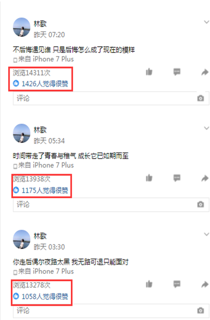 比如说林歌这个大号,发布的内容风格很统一,几乎都是情感型内容,说说更新频率也很高,粉丝互动性又强,就非常适合社交类产品进行投放。