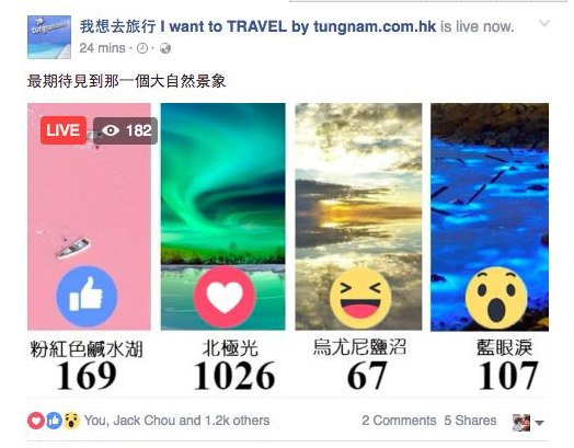 至于要怎么办一个好的竞赛活动呢?最重要的是,你所办的活动一定要和你的主要目标客群有所连结,如此一来不仅能巩固品牌形象,更能增加与消费者之间的连结。 3. 直播有趣的事 随着网络和社群媒体的功能不断推陈出新,从Snapchat的阅后即焚到Instagram的Stories,Facebook的Messenger,实时信息的流通变成是一种流行,人们可以上传一段影片或是照片,在24小时后就消失。Facebook到Instagram的直播功能无疑也是希望能增加使用者在社群媒体上的停留时间。 因此若能赶上「新功能」的潮流,理论上人们都会跃跃欲试。像去年有阵子就很流行脸书不同的表情符号投票直播相信你一定不陌生。
