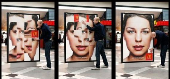 那要怎么透过互动来增加潜在消费族群的涉入程度呢? 其实互动营销跟「个人化」营销有异曲同工之妙,互动营销就是另一种「一对一营销」的模式。就1996年哈佛商业周开的报导,互动营销就是一个可以提供消费者量身定做的个人经验。从过去的论述到今日的经验,理想上,互动营销和个人化营销都是双向往来,并打造出相对应的个人独特经验。 比方说麦当劳的这个互动广告牌,用拼图的方式让增加人们驻足在广告前的时间: