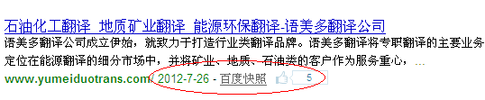 上图也是半个小时之类百度站长社区关于百度快照的讨论,快照真是把很多站长伤的不轻啊,都闹到百度站长社区了。 一,是什么导致近期百度快照不更新? 1.百度对你的网站权重降低。 2.网站内容长时间没有更新,或者说直接停止了更新,百度蜘蛛每次来访都空手而归。 3.网站内容与其他网站上的雷同,但权重没有其他网站高,文章抄袭过于严重被百度放入禁宫。 4.对照就不更新了。 5.网站进行重大改版,导航与目录地址大改变,也会引起快照不正常或停止更新,除非你网站权重较高! 6.你的网站空间或服务器是否稳定,如果网站空间经常问题,特别是晚上12.00到次日凌晨7.00 这个期间是搜索引擎蜘蛛经常访问网站的时间,所以空间和服务器的稳定性非常重要! 如果以上7点你都没有的话,那就需要按兵不动,先看看别的网站是什么情况,如果大部分的网站的快照都没有更新的话,那就很可能是百度方面的问题了。按原计划更新网站就行了,一段时间过后肯定更新的。 二,投诉快照是否有效? 投诉快照这一招语美多翻译公司是屡试不爽啊,投诉了一下快照立马就更新了。