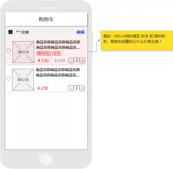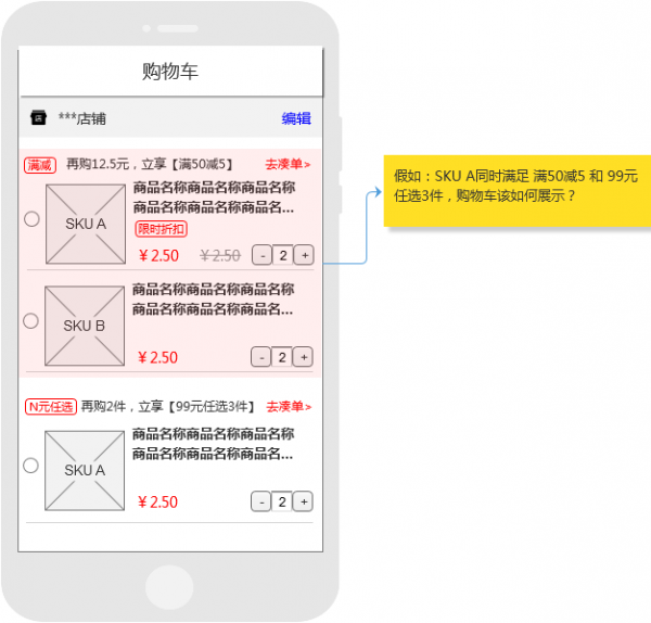 京东618大促落下帷幕,伴随着1199亿元的销售业绩令人瞠目,如此庞大的促销活动,是如何做到的?如果一个商品既参与了特价销售、又参与了平台跨万店满减、还参与了店铺内的优惠券减额等等促销活动,那这个商品会不会存在不要钱白送的情况? 当然,你可以认为笔者在杞人忧天,就算亏那也是京东的事情,但是笔者并不是要讨论京东赚了或者亏了多少钱,而是要说这考验的是产品设计者的智慧。 在这篇文章中,笔者总结了设计电商促销系统的基本原则: 同类型通过实体进行互斥、不同类型可以相互叠加。 笔者大致描述这条原则如下:在你设计促销功能时,需要考虑当前促销功能是属于以下哪种促销类型,再使用这条原则通过实体(这里说的实体是商品或者订单)和其他促销功能进行逻辑互斥。 三种促销类型:修改价格类型、修改商品小计金额类型和修改订单金额类型 例如:如果你设计的促销功能是秒杀,那么这个活动就属于第一种:“修改价格类型” 的促销活动,它需要通过实体(商品)来和 同类型其他促销活动 进行互斥,也就是说:在设计秒杀活动功能时需要考虑到参与秒杀活动的商品不能同时参与其他修改价格类型的促销活动。而,这种类型的促销活动有:拼团、限时折扣、降价拍等等。 以上为背景和回顾,下面正式进入本文内容: 就如笔者之前所述:这条原则是没有考虑任何使用场景、完全基于系统计算逻辑总结的规律,但是就连笔者也无法回避电商产品是由运营驱动的残酷现实。这也就决定了,这条原则如果不符合用户使用场景,不能提高运营效率也终将是一个自嗨的结论,没有任何价值可言。那么今天,笔者就将进一步阐述这条原则能否满足实际使用场景的要求。 所谓实际使用场景,无非就是线上和线下两种情况,本文将结合电商购物车这个促销重要载体来对以下五种不同的情况进行逐一分析: 第一种情况:针对线上,如果一个商品能够同时参与两个不同的第一种促销类型,会如何? 第二种情况:针对线上,如果一个商品能够同时参与两个不同的第二种促销类型,会如何? 第三种情况:针对线下,如果一个商品能够同时参与两个不同的第一种促销类型,会如何? 第四种情况:针对线下,如果一个商品能够同时参与两个不同的第二种促销类型,会如何? 如果一个商品同时参与了上述三种促销类型活动,可以吗? 第一种情况 针对线上,如果一个商品能够同时参与两个不同的第一种促销类型,会如何? 常见的第一类促销活动有:拼团/阶梯拼团、团购、秒杀、限时折扣、降价拍等 假如你是产品经理,现在要你设计一个第一种类型促销活动,比如限时折扣。你把玩了各种竞品的前端交互,并开始设计设计自己的限时折扣活动,然而竞品并没有告诉你如果和其他促销冲突时该如何处理,你也没有考虑到如果有其他促销的情况,你的产品也顺利上线了(假设)。好了,运营喵们开心的去策划促销活动,SKU A 先是被一个运营喵参与了秒杀活动,然后另一个运营又选择了这 SKU 参与你设计的限时折扣的活动,结果会如何? 因为同一个SKU 在同一段时间内具备了两个价格(一个秒杀价格,一个折扣价格),这时候系统该选择哪个价格作为这个SKU的价格呢?如果一个用户恰好添加了这个SKU 到购物车,那么购物车的促销怎么展示?画风是这样的,大家感受一下: