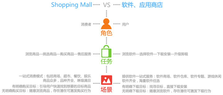 2011年各大移动应用商店迅速崛起,群雄割据。在移动应用商店的基础上,软件商店也悄然形成。这些软件、应用类商店形式多样、风格迥异。一些成功的应用商店都已然向“shopping mall“迈进:比如应用商店的大赢家苹果APP Store(i Pad、iPhone), 国内的安卓市场、网易应用、腾讯应用中心等等。这些商店成功的秘诀在于他们不仅仅将产品定位于一个简单的提供应用下载的工具,而是精心运营和设计,创造出一站式提供应用服务的场所。 怎样的软件应用类商店是最完善的呢? 如何使软件应用类“商店”提升为“shopping mall”呢?对此,本文从shopping mall的规划原则着手,找寻其与软件应用商店的共通点。通过任务和场景对现有的几大应用商店进行分析,提炼软件应用类商店的设计要素。 Shopping mall的定义是:大型零售业为主体,众多专业店为辅助业态和多功能商业服务设施形成的聚合体。而一个完善的软件应用类商店应该是集仓储、商场、服务与一身的软件应用中心。就如一个完善的购物中心,销售的是种类各异的软件。下图从角色、任务和场景3个方面对shopping mall和软件、应用商店进行对比分析。