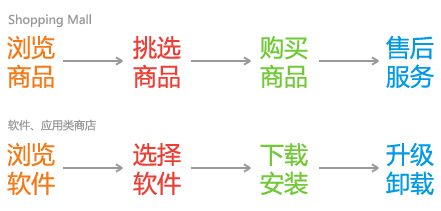 分析来看,shopping mall和软件应用商店任务和场景类似,二者有许多共同之处。因此,软件应用商店的设计可以借鉴shopping mall的一些成功要素。下面就从任务和场景两个方面出发,分析软件应用商店中可参考的设计要素。 任务——创造舒适贴心的购物过程 Shopping mall中商家的盈利来自于消费者的购买行为。因此,提供便捷高效的购买服务是每一个shopping mall必备的方面。商家对于购买行为的每一个环节都进行了全面的思考,包括商品的挑选,商品的携带,商品的付款,以及上门安装、售后保修等等。对于购买行为中的每一个步骤,商家都经过悉心设计,力求不忽略任何细节,保证消费者整个购物过程的顺畅和满意。