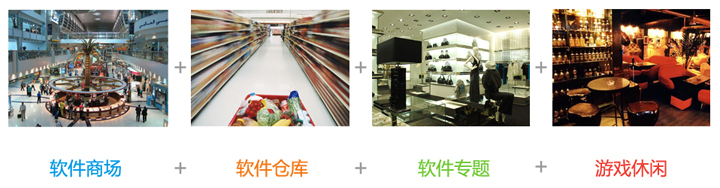 同样,用户在软件应用商店中的任务与shopping mall 类似。如上图所示,用户在商店中的主要任务包括:浏览软件、选择软件、下载安装软件以及软件的“售后”:升级和卸载软件。 (1) 想要创造舒适贴心的软件“购物”过程,首先要提供良好的选购环境,方便用户浏览和选择软件。 (2) 其次,要保证软件的下载和安装过程的流畅,并及时反馈下载安装进度,让用户可以统一管理自己的下载内容。 (3) 最后,软件商店想要成功,提供良好的“售后”服务尤为关键。提供及时、便捷的软件升级和软件卸载流程,是挽留用户的有利手段。 场景 shopping mall和软件应用商店的场景可以分为场景概括和场景细分两个方便,下面就针对不同场景中的设计点分析软件应用商店的可借鉴方面。 场景概况 1. 一站式享受 Shopping mall是一种集购物、餐饮、住宿、休闲、娱乐和观光旅游为一体的“一站式”消费场所。功能全,集购物、餐饮、休闲、娱乐、旅游甚至金融、文化功能于一体,进行全方位服务。一个真正意义上的shoppingmall大体包括主力百货店、大型超市、专卖店、美食街、电影院、滑冰场等娱乐场所。 同样,软件应用商店要想成功也取决于能否为用户提供一个系统全面的软件服务场所。单纯的提供软件下载已经不能满足用户需要。想要成为软件应用shopping mall,新型的软件商店要具备活跃的软件商场(百货店)、软件仓库(大型超市)、专题市场(品牌店)、娱乐中心(餐厅、电影院等)等系列场所,如图。在这里,用户可以在软件商场中闲逛,在仓库中找寻目标、在喜爱的专题市场徜徉、在娱乐中心休闲一下……快乐的同时还能适时管理自己选购的软件,只有这样,软件市场才能满足用户的一站式软件享受。