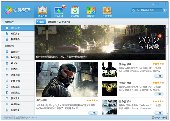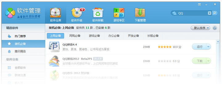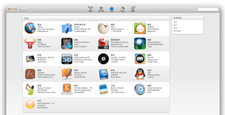 除了传统分类外,一些针对不同使用场景或用户类型进行的软件分类形式也能为特定用户提供更加便捷的通道。下图所示软件仓库中就针对“装机”场景下不同的用户需求进行了细分:上网、网购、游戏、办公、开发、炒股,为用户找寻相关软件提供便捷直观的途径。