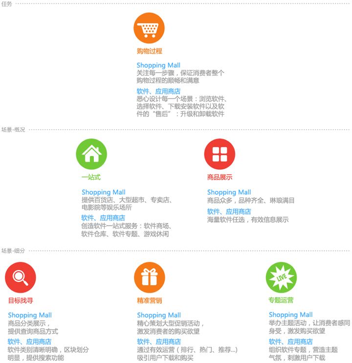 专题区的背景设计可与专题风格保持一致,经过特殊渲染的设计更能营造出与众不同的专题氛围,让用户愿意沉浸在专题中。专题中软件的排列形式也可与普通的排列形式区分,风格迥异的排列方式更能体现专题的与众不同。在软件的表现上,可根据软件自身的不同决定选择图标或是图片。例如对于具备精美图片的软件尽量选择图片来进行展示,而对于功能性软件则用图标即可。 对软件专题的精心设计是激发用户潜在需求的有利手段,就像消费者容易被商家精心策划的主题活动所吸引一般。当用户徜徉在精美的软件专题之中,感同身受的体会着专题的氛围,又怎能不被专题的内容所吸引,心动不如行动的下载和购买呢? 综上,分别从任务、场景中提炼总结了shopping mall的6个成功要素,如下图。将这些要素有效的利用到软件应用商店的设计中,即可实现从“商店”到shopping mall的跨越。
