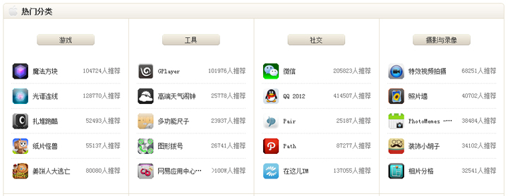 场景细分 1. 目标购买-能够快速找到想要的商品 在商品众多的基础上,消费者能否从众多的商品中找到所需的商品也是商场的关键。就像商场中会对不同类别的商品进行区分一样,软件商店中也要根据软件类型的不同进行分类区分,好的分类可以辅助用户快速找寻目标软件。如下图。(网易应用-分类、苹果商店-分类)
