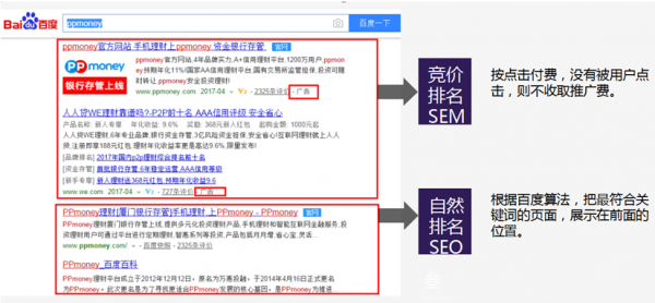 文章开始前,先给大家讲个故事。 这个故事大概发生在1998年,在美国斯坦福大学有两位天才学生,他们开发了一套检索工具,后面这个检索工具供全球的用户用于搜索信息,这个工具就是谷歌。 为什么讲这个?因为这个与这篇文章的主题“SEO如何获得免费百万流量”有关联,这个流量就是指网站的流量。 一、走进SEO 什么是SEO?SEO的概念就是搜索引擎优化,它的目的是在搜索引擎中获得关键词的排名以获得精准的用户进入网站,然后产生销售或者品牌推广的目的。 大家都了解互联网的发展史,有三大发展阶段: 1、Web1.0时代,是“堆”的阶段 这个时候是互联网刚刚兴起的时候,网站信息开始像货物堆积在那里,用户能够被动地获取一些信息,网站以门户网站为主。 2、Web2.0时代,“搜”的阶段 用户可以通过搜索引擎去搜索他所需要的信息,如他可以通过谷歌或者百度去搜索他所需要的相关信息。 3、信息大爆炸时代 这时候各行各业出现了大量的网站,这些网站的竞争相对很激烈,所以这些网站如何去获得用户?这就需要推广。 搜索引擎就是诞生于“搜”的阶段,然后普及于推广的阶段。国内SEO真正发展是在2004年到2005年之间,随着SEO的兴起,很多公司成立了自己的SEO部门,就像我们部门一样。 国外三大搜索引擎——谷歌、雅虎、必应,国内三大搜索引擎——百度、360、搜狗,百度占的份额至少是60%,360占20%左右,搜狗占10%不到。 SEO获取流量的流程示意图大概是这样的: 1、先了解用户的需求。需要了解网站目标客户的需求有哪些? 2、通过信息分析创建满足用户需求的网站。 3、建好网站之后,我们就需要手段获取免费流量和用户并引导用户的需求。 4、满足、引导用户需求,这个是一个不断循环,不断优化的过程。 二、SEO原理 因为做优化需要懂得百度搜索的原理。比如搜索PPMoney的时候会出现下面两条信息。前面两条带有广告是付费排名,这里是按点击付费。 下面就会出现官网、首页和百科。这里是自然排名,不是付费的,根据百度算法,最符合关键词的页面会展示在前面的位置,包括官网和百科。 大家可能也在平常工作中听过“SEM”这个词。SEO和SEM不是对立的。SEO投放广告的效果比较快,其实它们是相辅相成的。