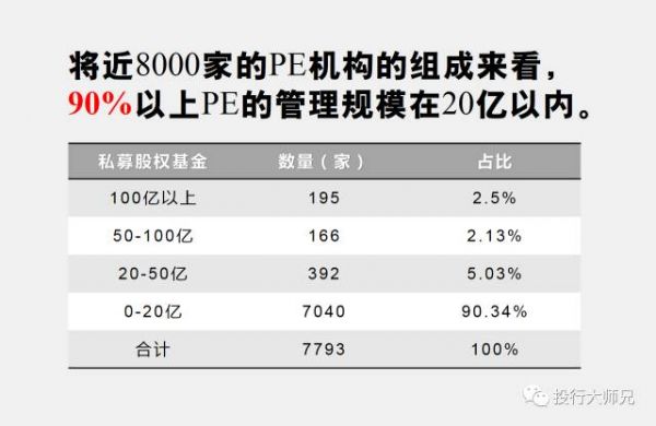 自2014年私募被正式划入正规部队后,PE进入了野蛮发展期。彼时,我们看到,无论是公募、券商等奔私的金融大佬,上市公司大股东,还是娱乐明星们都纷纷加入私募行业。即使经历了2016年监管层发起的两轮“大清洗”,如今依然保留了将近2万家的规模。 下一次厨房做几道菜并不难,但是要开一家持续赚钱的餐馆却并非易事。 这一次的乐视事件中,PE散户化现象表现的尤为强烈。很多人应该不会忘记,2015年整个市场都在疯抢乐视体育B轮投资份额的荒诞场景(刘涛的1000万血汗钱就是在这一轮被深套的),这跟二级市场疯狂追逐概念股如出一辙。面对乐视的今天,不知道那些花了高昂FA费用抢到份额的PE机构作何感想? 那个以豪赌新三板著称的某机构,曾经对外宣称自己的年化投资收益率超过70%,并喊出了几百亿的估值,真正是惊呆了PE行业的老司机们。尽管如此,还是有很多“专业投资人”对其趋之若鹜,无数LP纷纷慷慨解囊。如今它却打了个“骨折”,找了家老实巴交的上市公司把自己给“嫁”了。 历史一再教育我们:莫怪骗子太狡猾,只怨自己不专业。一些明显偏离常识的故事也能应者云集,还是因为中国PE界的散户太多。 二、头部化 任何行业都会经历从野蛮发展到行业洗牌再到不断集中的过程,投资行业也概莫能外。实际上,这两年PE行业已经开始展露寡头化的苗头,好的资源正不断向头部机构聚集。有人戏称,如今的PE格局是BAT以及其他机构。 从募资的角度看,且不说孙正义成立的千亿美元基金,国内的也要不少像高瓴资本这样的投资机构,管理规模也已经突破了千亿(人民币)规模。 再从投资的角度看,几乎所有的明星项目都被人们熟知的几家知名机构投了,大部分的PE机构只能在头部机构看不上的项目里挑挑拣拣。其实这也正常,就像男女结婚也讲究门当户对一样。不仅头部机构在不断寻找明星项目,明星项目也希望能有明星机构来给他们做背书和导入资源。
