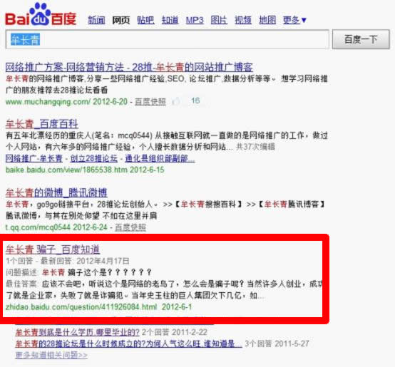 以前我们谈起SEO,大多局限在我的网站在搜什么关键词排在什么位置这样一个层次,这个理解下的SEO,无非是发帖子、发链接、改代码这个级别的。 实际上这样理解SEO是非常片面的。 我将SEO分四个层次,第一层,也就是说最低级的是关键词优化,仅关注一个或几个关键词的位置;第二层是整站优化,关注大量关键词被搜索到的概率;第三层是信息覆盖率优化,关注的是除自己网站外,还包括站外与自己相关信息在搜索引擎上的表现;董敬一网络营销认为,SEO的最高层次第四层是口碑SEO,除前三层的内容之外,更关注口碑通过SEO的传播。 通过SEO让客户找到你,这是最基本的。通过SEO让客户找到你的正面评价,找到别人都说你好,这个更重要。因为客户想找的不仅仅是一家供应商,客户想找的是一家值得信赖、靠谱的供应商,也就是说,SEO,O什么,更重要。 例如: 我们百度搜索大名鼎鼎的“牟长青”,我们发现,他的博客自然排名百度第一位,但是这个效果并不值得高兴,因为首页还有一个骂他是骗子的帖子。