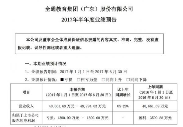 来源:同花顺 公开资料显示,作为从事家校互动信息服务专业运营机构的全通教育,于2014年1月登陆创业板。 2015年头顶“在线教育第一股”的光环,全通教育开启股价飙涨模式。2015年3月,全通教育就以199.90元/股的价格取代贵州茅台,成为当时沪深两市第一高价股,市盈率一度达到800倍。 之后,全通教育股价一路狂奔。2015年5月13日,全通教育触及467.57元的历史最高价,这一价格也成为A股史上第三高价。彼时,全通教育的动态市盈率已经超过1600倍,成为国内市值最大的教育类上市公司。 之后,股价一路下行,近两年来,市值缩水严重;另一方面,公司业绩也开始出现下滑。就在今年7月16日,全通教育发布了2017年半年度业绩预告,预计今年上半年将改变以往的盈利状态,预计亏损1300万元~1800万元。