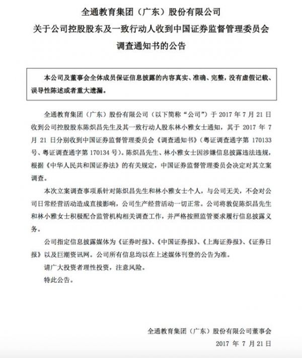 屋漏偏逢连夜雨,外界担忧,此次公司控股股东被立案调查,是否会成为压垮全通教育的最后一根稻草?另外,陈炽昌的创业故事也为外界所聚焦。 此次公司控股股东双双被立案调查,是否会成为压垮全通教育的最后一根稻草? 7月21日晚,曾经的“A股第一高价股”全通教育发布了“关于公司控股股东及一致行为人收到中国证券监督管理委员会调查通知书的公告”,公告称,公司控股股东陈炽昌及其一致行为人林小雅(注:二人为夫妻关系)因涉嫌信息披露违法违规,根据《中华人民共和国证券法》的有关规定,二人被中国证监会立案调查。