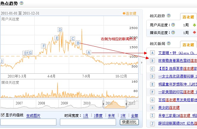 图1 根据这些趋势与规律可以很好的分析出:这个词应不应该做,有没有发展潜力,在什么时候开始做最好,员工应该安排在什么时候上班......从而达到更好来安排相关的的工作进展。 第三,多个关键词搜索量对比;用类似相关关键词同时对比,结合每个关键词的搜索趋势,就可以有效的看出人们的搜索习惯、以及搜索习惯的转变等。从而得出更好的关键词策略,使关键词布局更加的合理。 第四,关键词热点新闻;这个主要是拿来看下这个行业以前有什么重要的新闻事件,从新闻事件里能否看出什么政策、行业趋势等。(如图2)