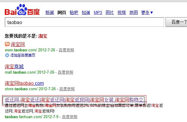 2012年7月初,百度对淘宝客进行的又一轮封杀,从百度“淘宝网”搜索结果的变化中拉开帷幕。从我之前的一篇文章——《第三方导购平台面临困境 实施改变势在必行》以及之前A5的一ID“该用户特帅”写的几篇文章中,我们可以清楚的看到这搜索结果的有趣变化,从返还网在搜索结果中消失、后来返还网和返利网集体消失,再来后返还网的二级域名()出现在搜索结果第三的位置上,接着该搜索结果页面又设置了404错误页面,阻止来自百度搜索“淘宝网”的流量进入返还网,最后这个页面连tite也改掉了,先看看改之前的title(感谢百度的快照提供):
