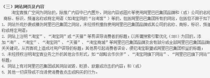 我们很清楚的看到现在的该页面的title已经发生了翻天覆地的变化。所有和淘宝网有关的字眼都去掉了。或许站长们过多的将矛头指向了百度和阿里妈妈,却忽略了阿里妈妈早前推出的一项规则——《淘宝客推广业务规范》(可以去淘宝联盟官网看看),有图有真相: