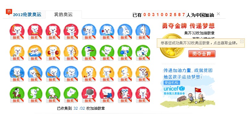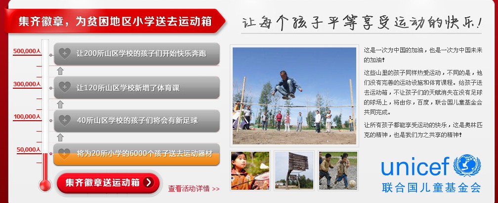 公益接力,传递梦想 而在最后百度还出动爱心传递,与联合国儿童基金会合作。只需用户集齐所有的加油徽章,百度便给贫困地区小学送上与运行相关的仪器礼品,让更多的小孩子享受运动之快乐。然而,就从这一点上看,百度的运营策划方案做得很高明。毕竟对于一个用户而言,仅仅是为了中国奥运健儿加油,也就可以为其集齐所有的加油徽章了,抽奖相信更多的是抱着无所谓的心态,可这爱心的传递确实很致命的原因。因此,对加油徽章的搜集,不但能为中国加油,能挣个抽奖的资格,更重要的是以举手之劳为贫困山区儿童做一点小小的爱心奉献,实在是难以让人拒绝,同样的,惠州SEO叶剑辉在写这篇文章之前也已集齐了所以的徽章。就从这一点看来,百度抓住了用户的心里,用最小的代价,从而保证了很好的用户体验,很好的口碑,以及疯狂的PV,仅仅从这一点上看,做得很是了得。