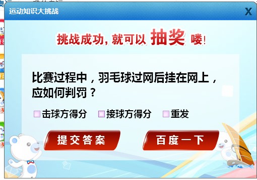 奥运知识问答 在“中国加油”这一功能中,每收集一枚徽章则有一次抽奖机会,而在抽奖之前还有这么一个奥运知识问答环节,只要正确回答即可抽奖,如此再参与抽奖活动之余还能学习相关知识,而哪怕是答错了还是可以重新回答的哦,而不会失去抽奖机会,百度如此做法,对用户而言自然很是友好。