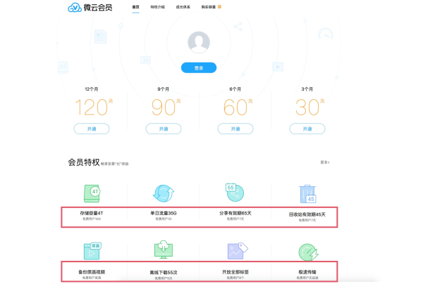b. 上下对比 为了让用户更直观的感知会员权限的份量,可以拿现有的免费权限作为参考,举个例子:微云。 它是在会员特权下面,放上免费用户权限做对比,来衬托会员的强大功能。采用浅灰色小字,不会给页面主要信息造成干扰,同时提升用户的购买欲。