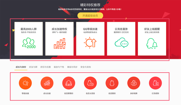 3. 突显核心特权功能 其实很多情况下,用户都是奔着那么一两个核心功能去的,比如开通印象笔记,一般都是为了更多设备可以同步,上传浏览量更大了;开通百度网盘会员,为了更大的容量和更快的上传下载速度;开通QQ会员,一般都是千人大群,成长速度,或者是名字标红…. 会员中心页面的处理,应该更有节奏感,突出核心特权,弱化辅助特权。而不是把所有能都平铺到页面上让用户自己去发现。 下面是QQ会员功能特权页面,核心特权和辅助特权的主次处理: