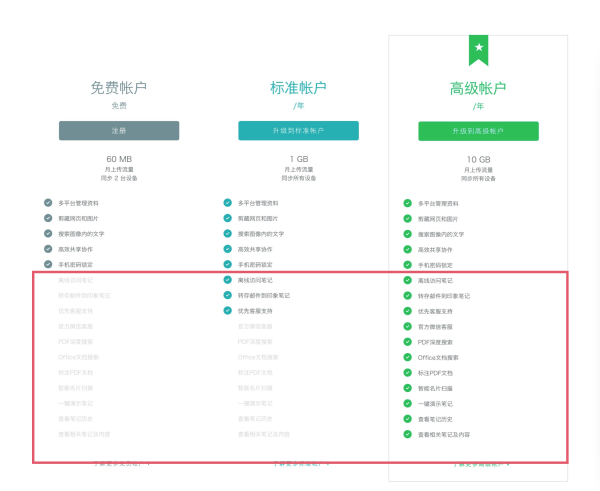 以提取出的设计关键词是:暗色调,更沉浸,留白。图标的处理上也可以倾向于表意清晰,去除装饰的,从而提升尊享感。 2. 功能特权对比 会员中心一般会呈现不同等级的身份,供用户选择。比如:会员和超级会员。从商业角度考虑,我们当然是希望用户去买更贵的超级会员,提升转化率,从而得到更好的收益。 那么这个时候设计师要做的就是把功能权益理解透彻,然后找到更合适的方式做权益对比,让用户一眼就能感知到超级会员牛逼,花钱值。 我大概调研了几种不同的处理方式: a. 阶梯形式对比 印象笔记会员功能对比做的非常清晰直观,功能维度单一,很直观的告诉用户一个概念:越高级,功能越多。 横向,对比共享权限;纵向,浏览独享权限。简单明了,用色方面也是等级越高,颜色明度越高,从而吸引用户注意力,引导开通高级账户。