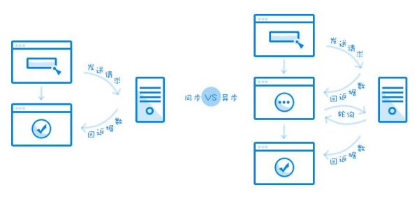 3. 前后端间 了解基本的前后端接口调用方法(会影响到具体的交互设计,如提交反馈),清楚基本的消息与通知机制(会影响的刷新、消息通知),主要还是要清楚前后端交互相关的一些内容,如下图是同步接口/异步接口对交互反馈产生不同影响的过程(简单描述)。