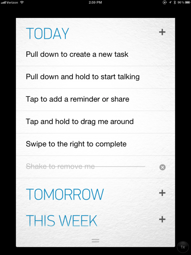 再来看Any.do,它要求用户在注册流程中做更多的事。在Any.do中,用户需要有效地使用app以了解app是怎么使用的才能完成注册。他们需要真正地照着任务要求去做。而“手指右扫完成任务”可以使app要求的默认任务消失。这些都比Astrid的注册要做更多的工作,但也帮助了用户未来更好的使用。