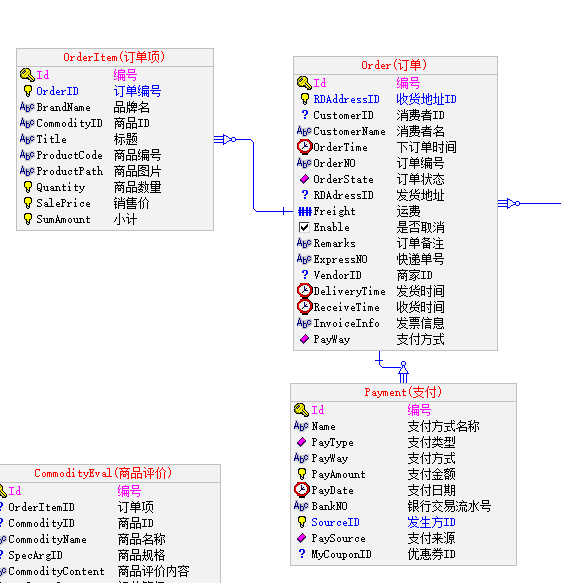 8. 下图是订单的表结构设计,订单表结构设计的另一个要点是,订单是消费者的消费记录,同时也是对商家结算的费用依据。本设计里对订单状态是“已完成”的订单进行结算。 订单业务流程里还有退款和退货,本流程里退款和退货有另外的表进行设计,再此不做阐述。
