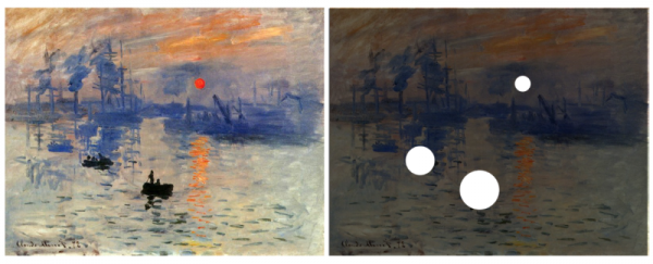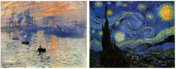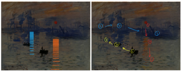 莫奈的《日出.印象》就是一副节奏很明显的绘画作品,太阳、船只形成稳固的三角形布局。