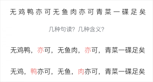 此句读来源于一段故事,有一教书先生很体谅穷苦人家,想免去穷孩子学费,但富人家则不能免,则给出同样的一段句子,只是断句不一样,便有了两种截然不同的含义,穷孩子只要青菜足矣交学费,而富人家则需要鸡/鸭、鱼/肉和青菜,可见不同的节奏传达的含义也会完全不同。
