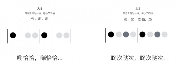 就像耳熟能详的节奏有“嘣恰恰、嘣恰恰”和“咚次哒次”,我将节奏用图形化的语言来说明一下,图中从黑到灰色代表声音渐弱,竖线分割每个小节,重复小节形成一段简单的节奏,形成“强弱弱”“强弱次弱”的有规律变化,而简单的重复让人可预知、可掌控,自然而然的产生舒适感。 中国古代的《礼乐记》中说:“节奏,谓或作或止。作则奏之,止则节之。” 节奏的断连顿挫也会表达出不同的含义,如下图: